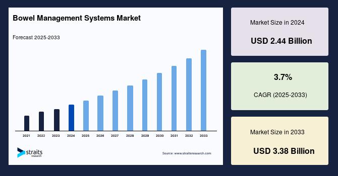 According to StraitsResearch, the global bowel management systems market size is valued at USD 2.44 billion in 2024 and is estimated to reach USD 3.38 billion by 2033, growing at a CAGR of 3.7% during 2025-2033.