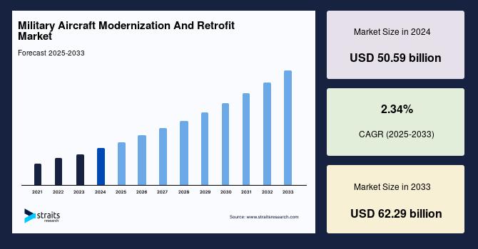 According to StraitsResearch, the global military aircraft modernization and retrofit market size was valued at USD 50.59 billion in 2024 and is estimated to reach USD 62.29 billion by 2033, growing at a CAGR of 2.34% during 2025-2033.