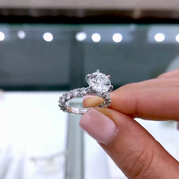 Three-stone rings are rich in symbolism, representing a couple’s journey together. Pavé bands add subtle brilliance, making the ring appear more radiant without being overwhelming.