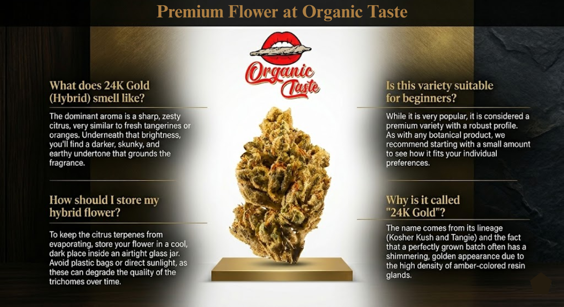 Discover the zesty tangerine aroma and golden frost of 24K Gold (Hybrid). Shop our hand-trimmed, laboratory-tested premium flower at Organic Taste today.